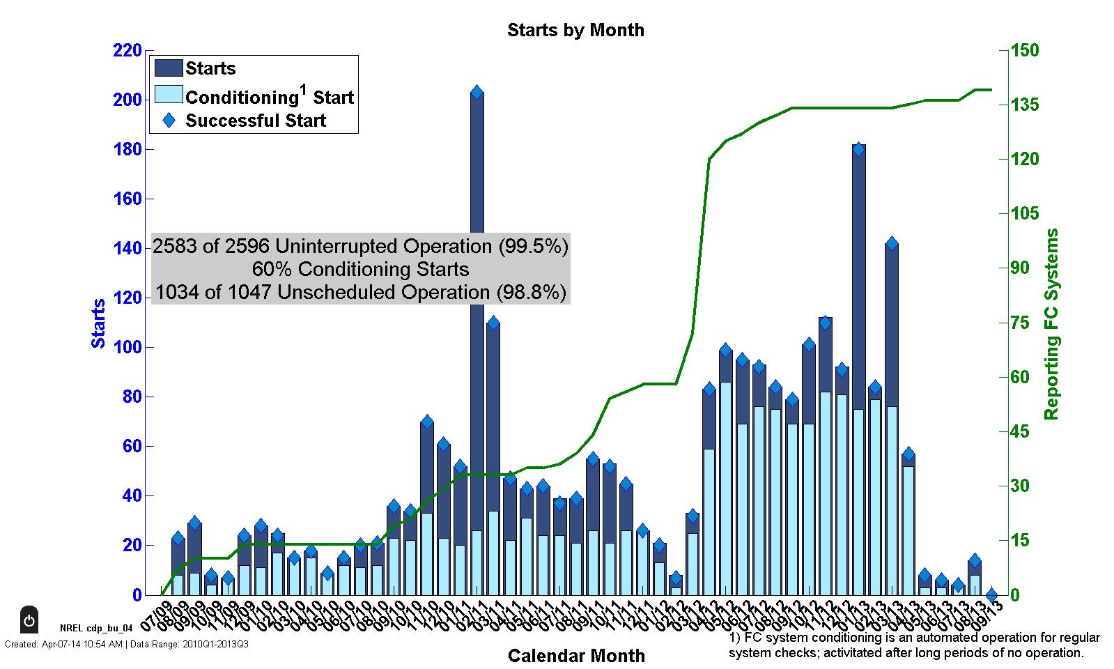 Fuel Cell Starts by Month, Reporting Systems, and Conditioning, CDP BU 04, 4/17/2014