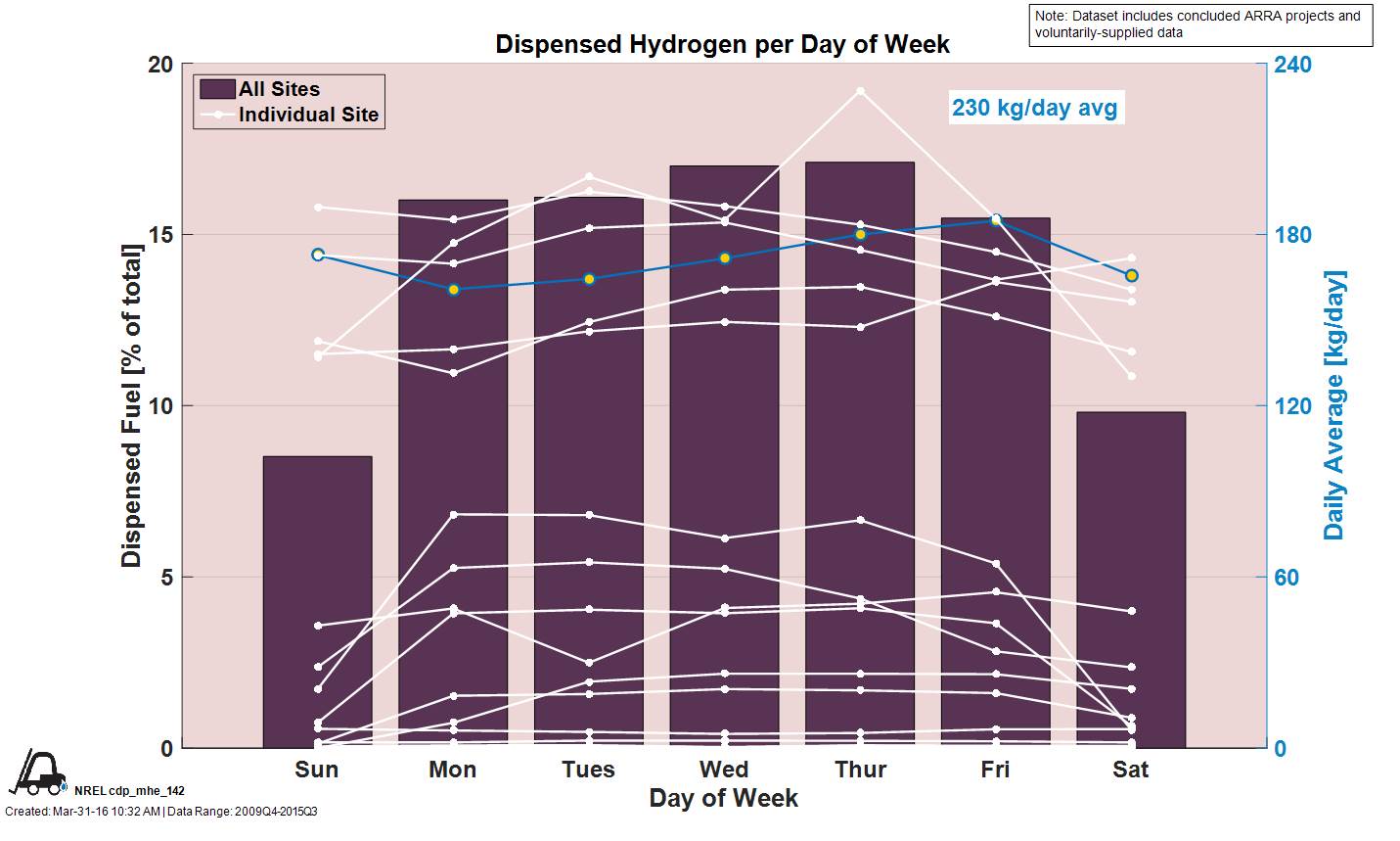 Amount of Hydrogen Dispensed by Day of Week, CDP MHE 142, 3/31/2016