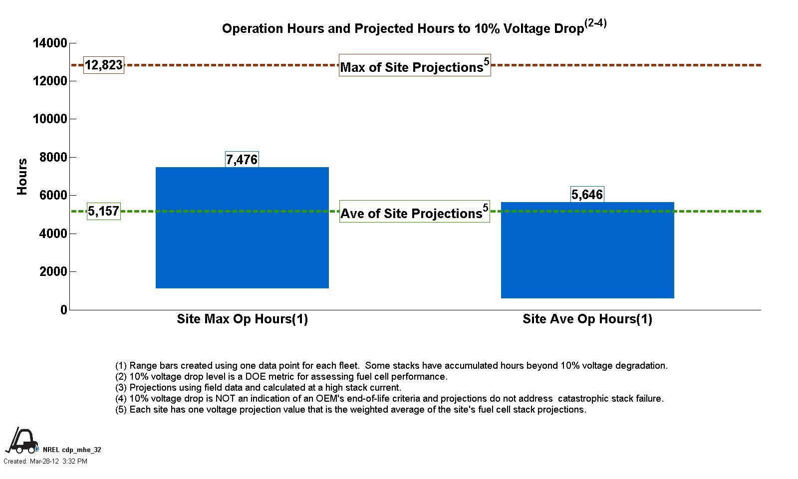 Fleet Fuel Cell Hours and Voltage Durability, CDP MHE 32, 3/28/2012