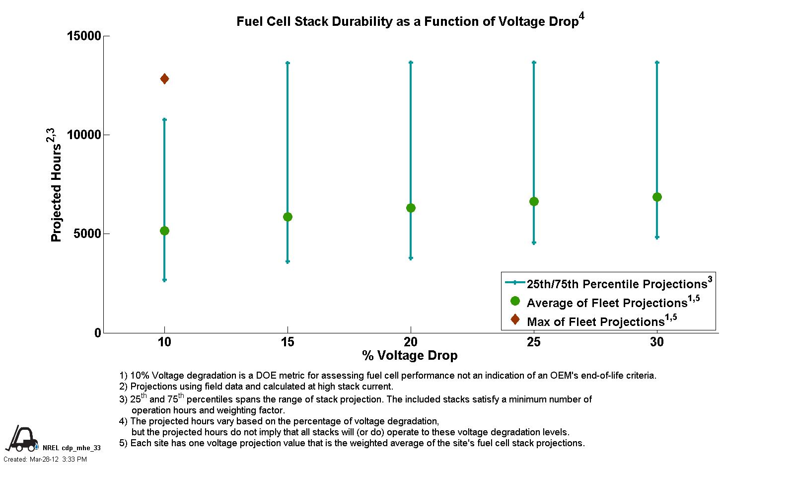 Fuel Cell Projected Hours to Various Voltage Drop Levels, CDP MHE 33, 3/28/2012