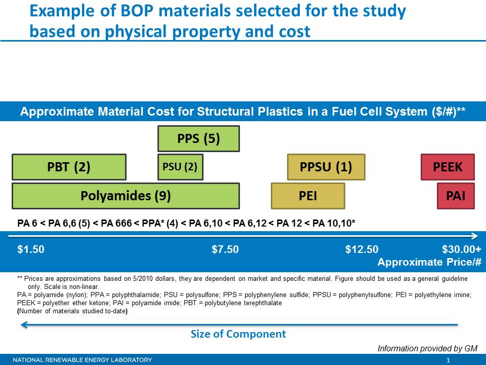 We chose materials based on several criteria: physical properties (able to withstand fuel cell operating conditions), commercial availability, cost, processability for high volume manufacturing, and input from original equipment manufacturers (OEMs) and fuel cell system manufacturers.