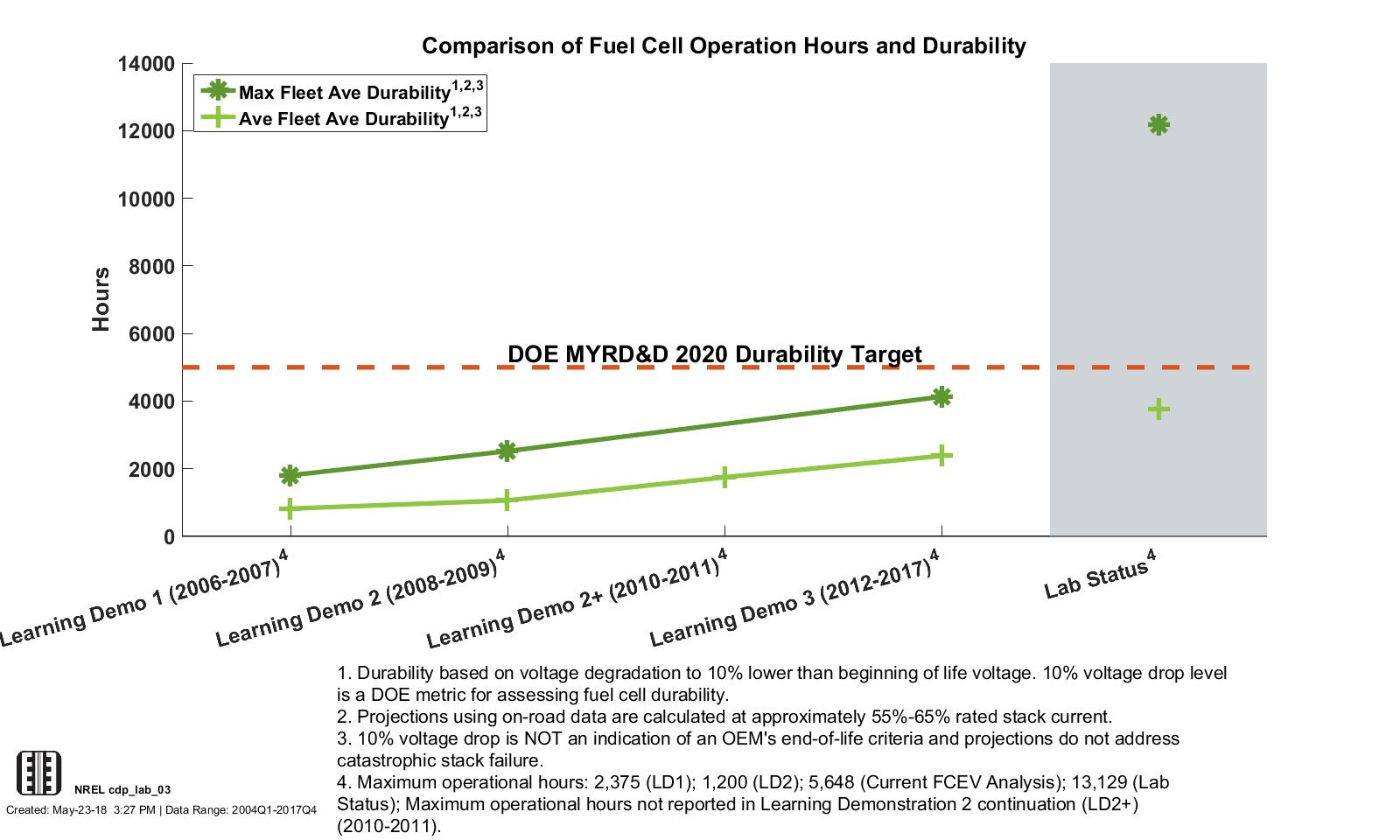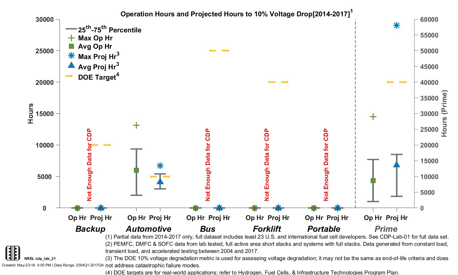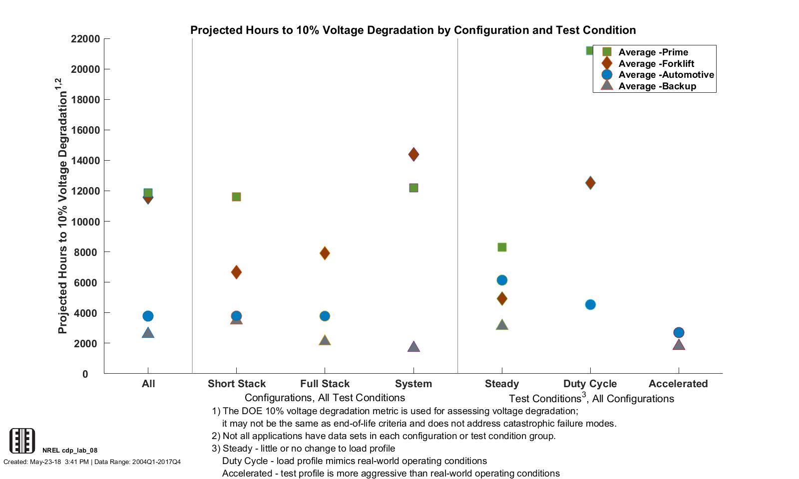 CDP LAB 20, 5/23/18 - Lab Data Hours Accumulated and Projected Hours to 10% Stack Voltage Degradation (2014–2017