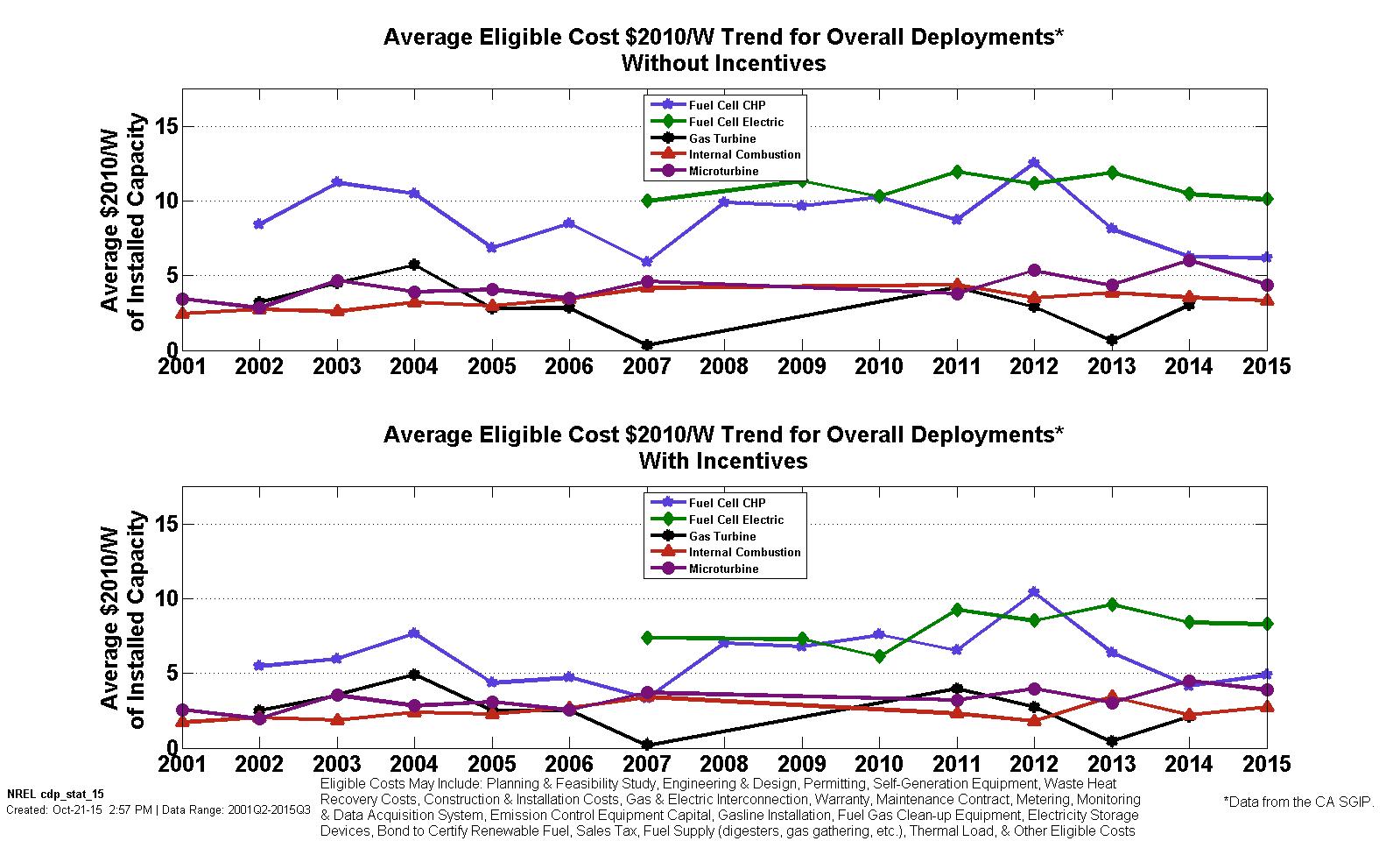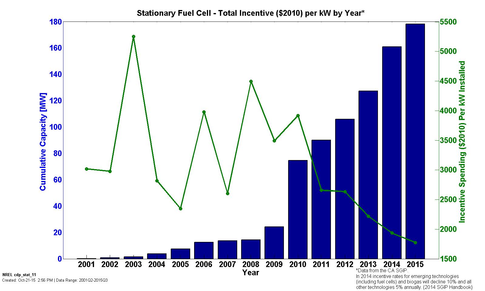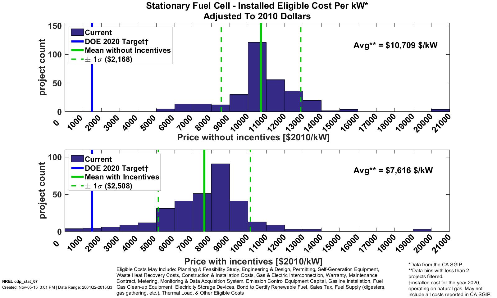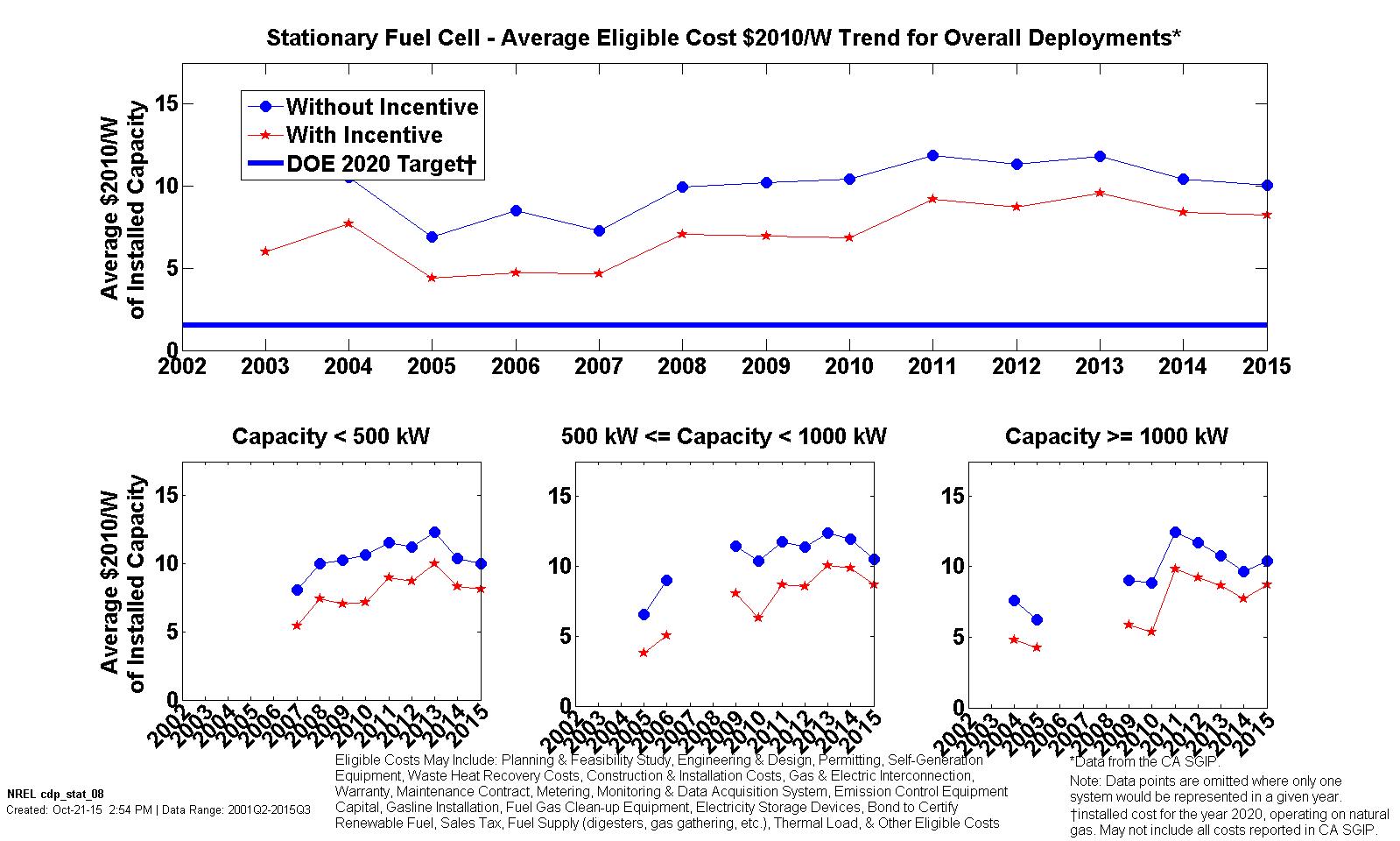 Stationary Fuel Cell Install Price over Time with and without Incentives
