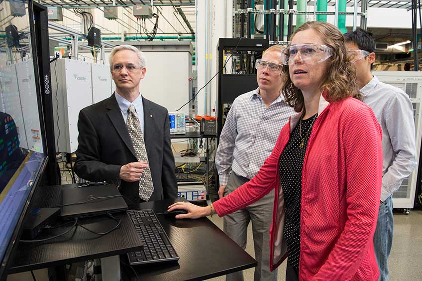 NREL researchers Annabelle Pratt, Chin-Yao Chang, Bri-Mathias Hodge, and Benjamin Kroposki collaborate in the Power Systems Energy Center in the Energy Systems Integration Facility (ESIF) at NREL.
