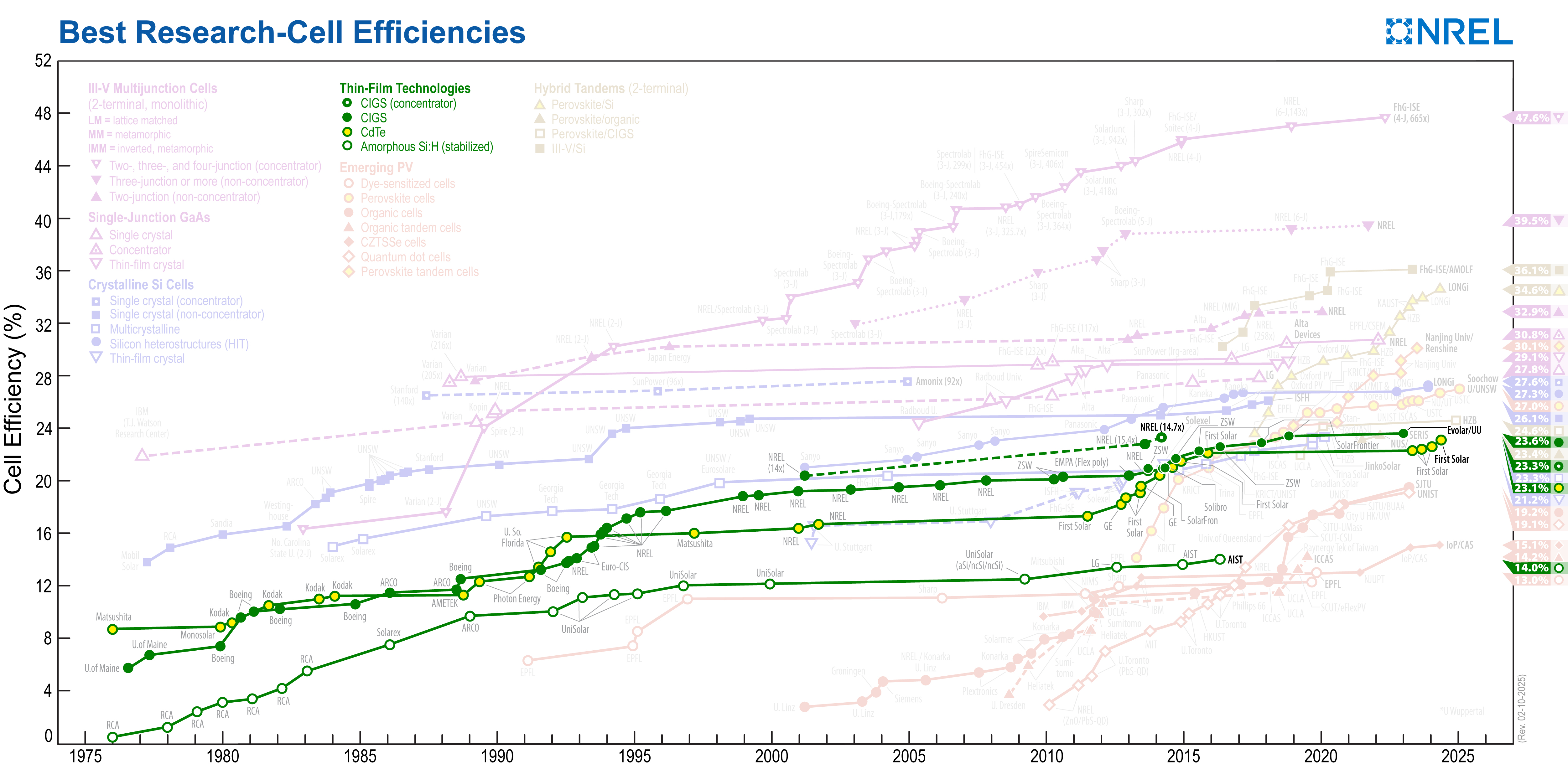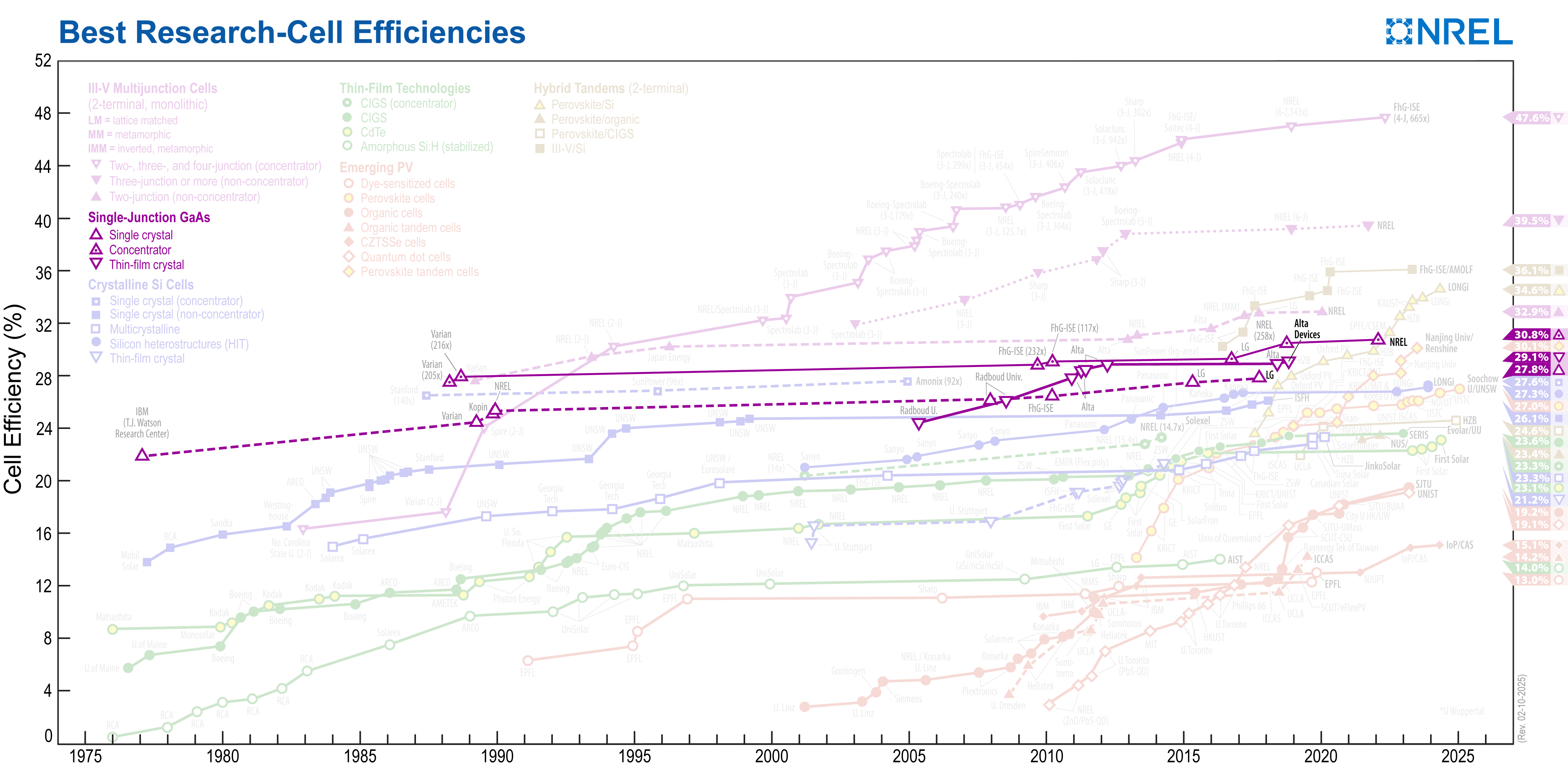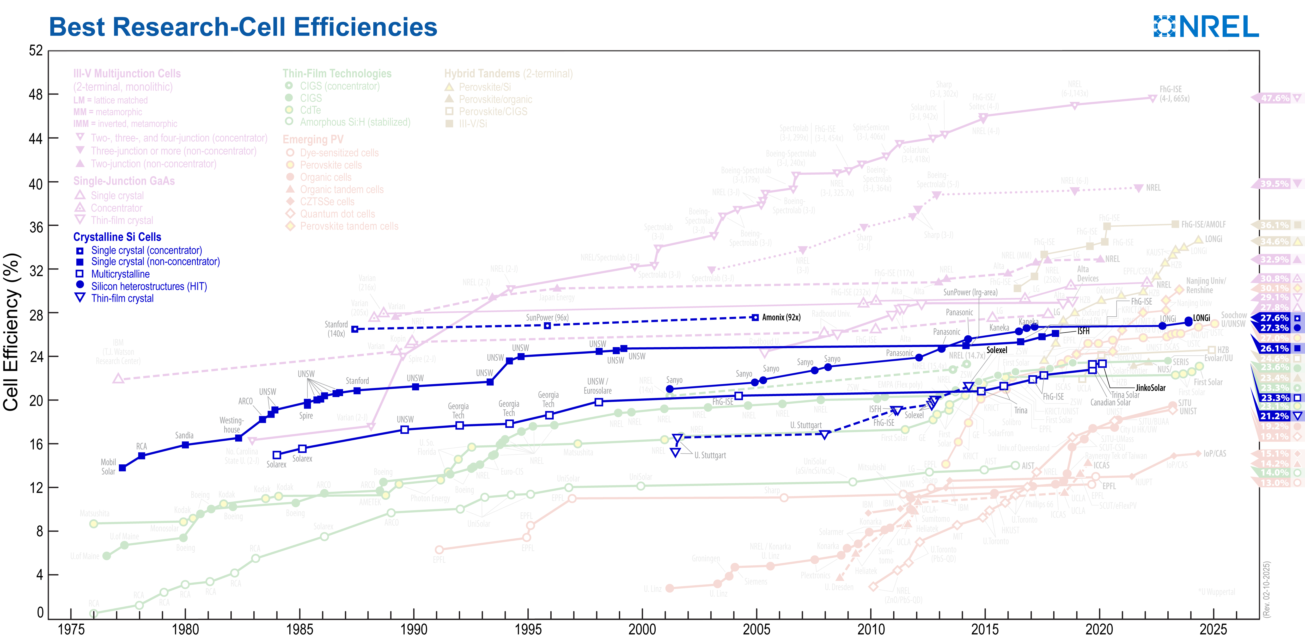 NREL maintains a chart of the highest confirmed conversion efficiencies for research cells for a range of photovoltaic technologies, plotted from 1976 to the present.