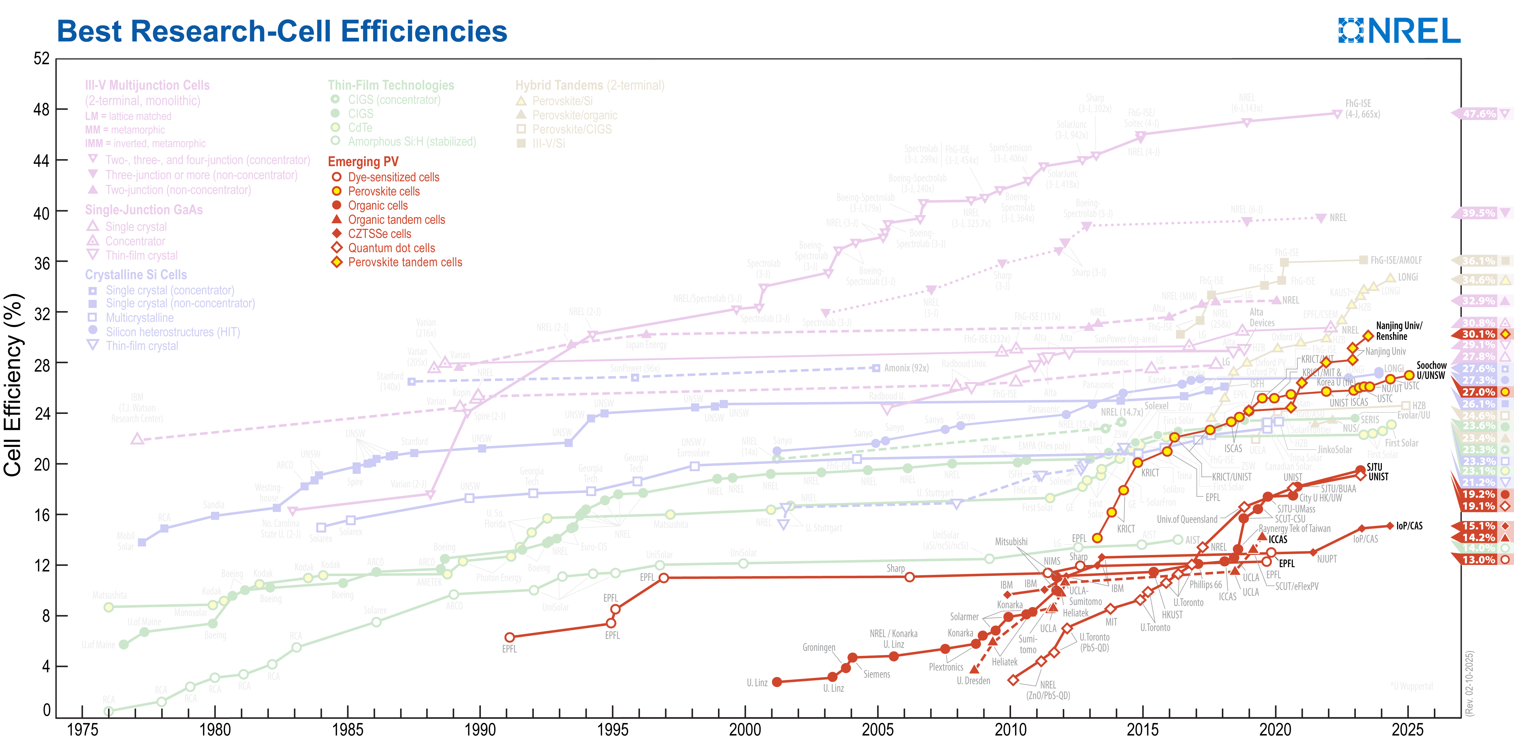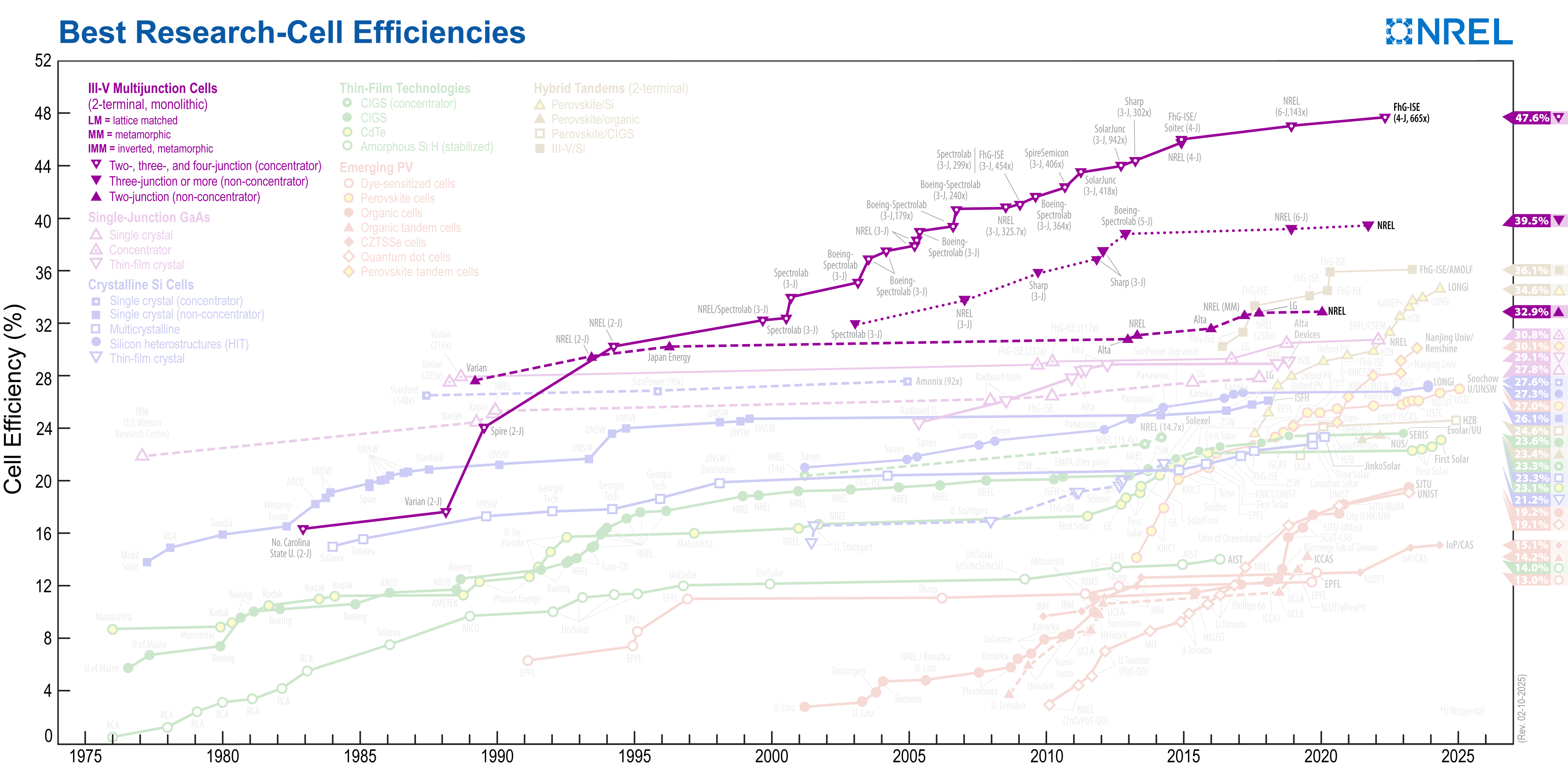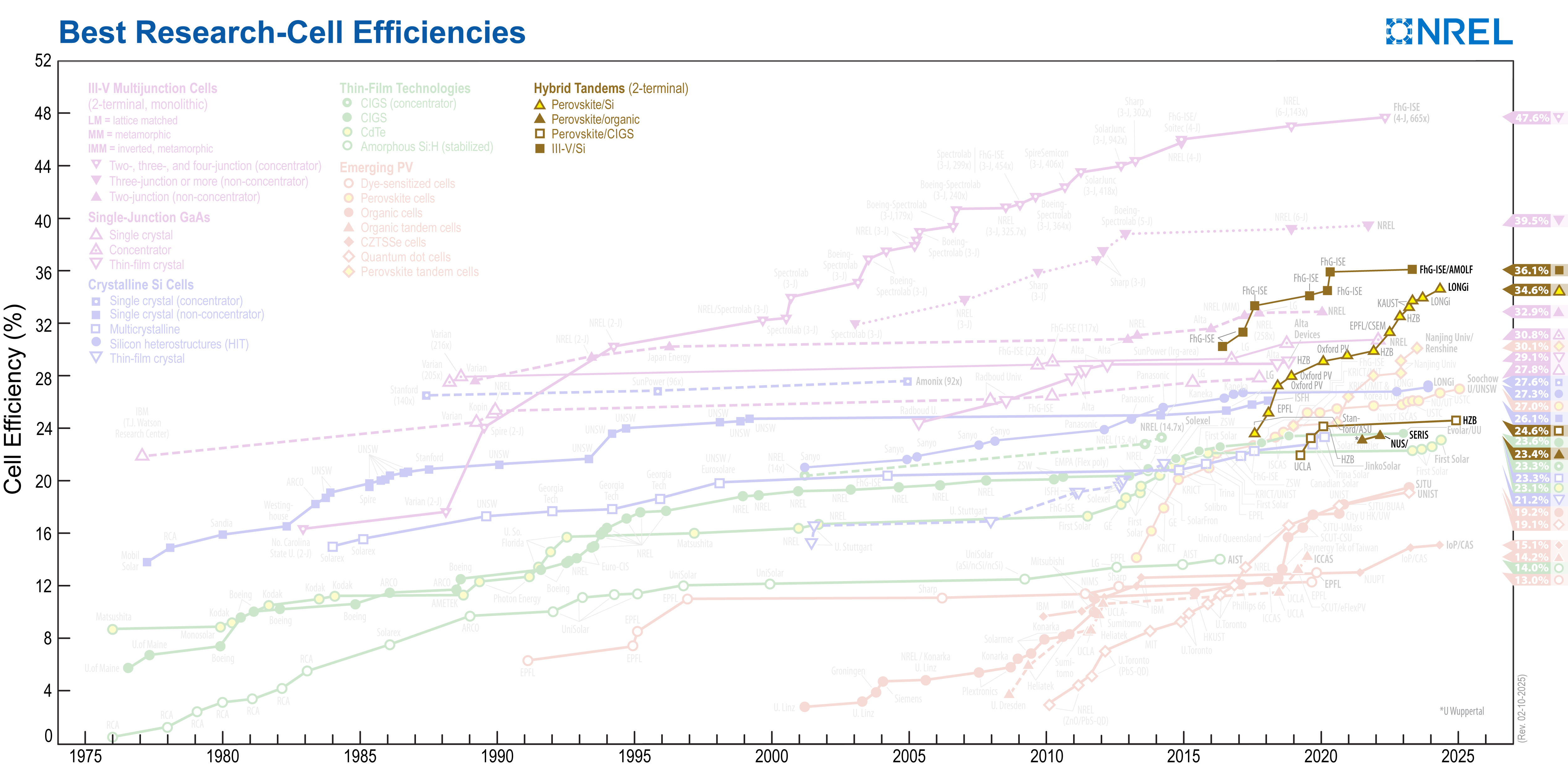 NREL maintains a chart of the highest confirmed conversion efficiencies for research cells for a range of photovoltaic technologies, plotted from 1976 to the present.