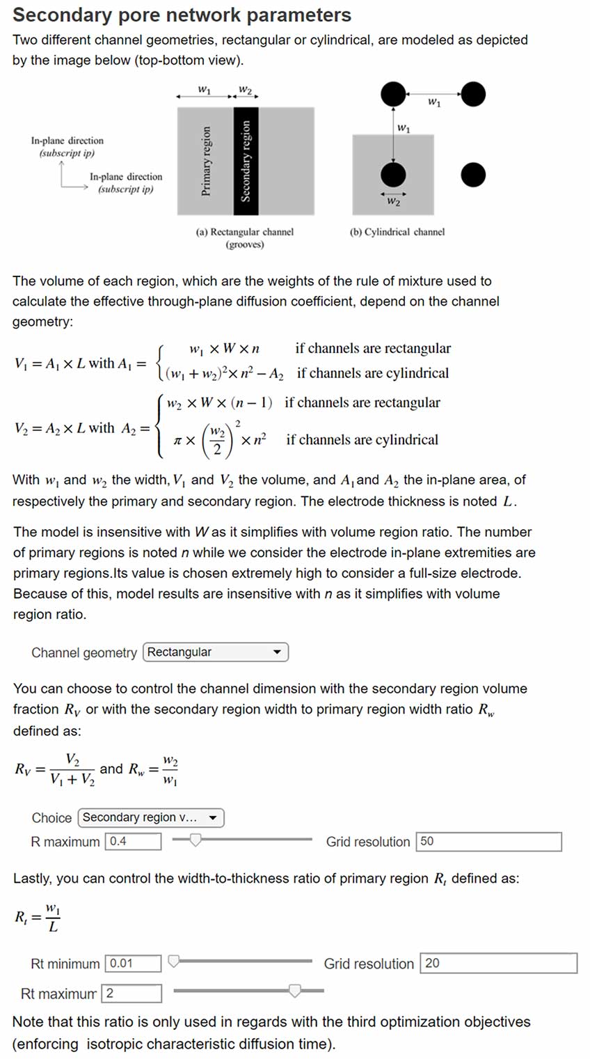 The model quantifies the impact of SPN, also called dual-pore network, on electrolyte ionic diffusion considering various pore channel geometries. It compares reference (i.e., without SPN) and structured (i.e., with SPN) electrodes at identical gravimetric and volumetric specific theoretical capacity. It also provides optimal design parameters according to different optimization objectives, all aimed to balance the improved structured electrode through-plane diffusion with the degraded porous matrix in-plane diffusion.